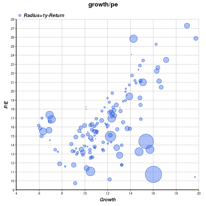 So the best picks, assuming we don't know anything else (but we do, see below, and we keep learning too), should lie in the lower right quadrant of the chart, somewhat below the PE/Growth=1 diagonal -- [Note that the chart origin is not at (0, 0) for better space utilization, so the PEG=1 line lies below and to the right side of the chart's main diagonal.]