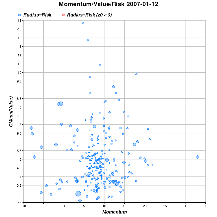 Risk: last, but not least: the Z axis (represented by the radius of the bubbles,) is a purely "technical" feature representing risk. It is based on three parameters (alpha, beta, and sigma) in a linear regression of daily changes, over the past year vs. the S&P 500 (SPY).
