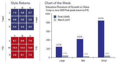 Standard & Poor's reported that the returns of the major indexes led active funds in both the small and mid-cap categories in the first quarter of 2007, while large-cap actively managed funds did beat the S&P 500 in the period. The S&P Indices Versus Active Funds Scorecard (SPIVA) results, showed that in the first quarter the S&P MidCap 400 outpaced 84.8% of mid-cap funds and the S&P SmallCap 600 led 53.5% of small-cap funds; 64% of their large-cap brethren beat the S&P 500.What you see here is similar to what we saw in the 6-month charts: small-caps are (relatively) the weakest compared to the active managers. Mid caps are the strongest, and large-caps are finally starting to gain ground. Comparative analysis is a very useful tool.