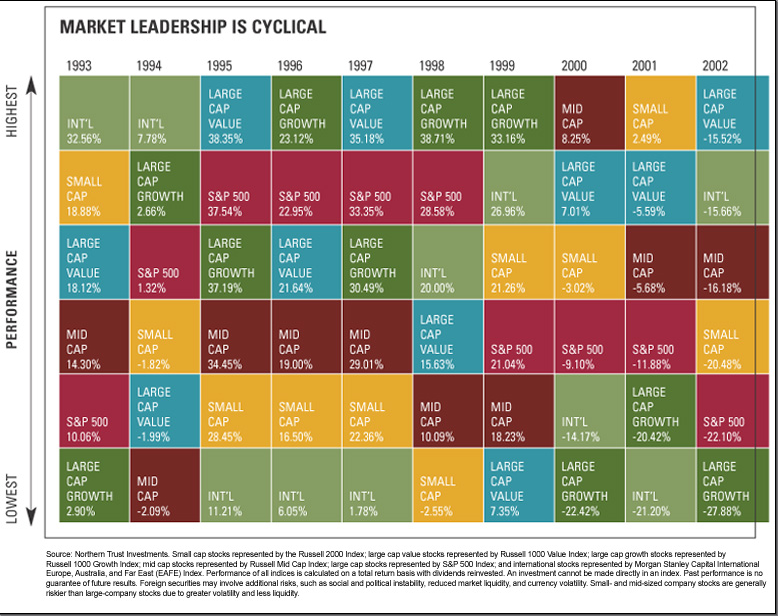 Here's a chart showing how market leadership has changed between 1993 and 2002 among different asset classes. The best performer in each year is at the top row and the worst in the bottom row.