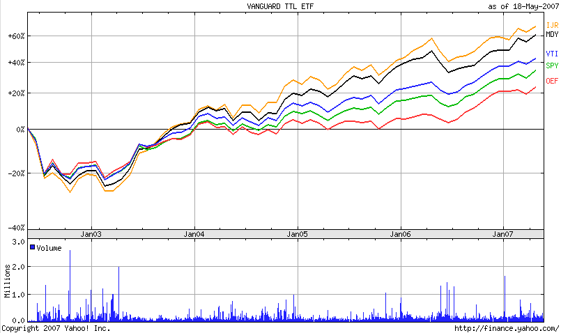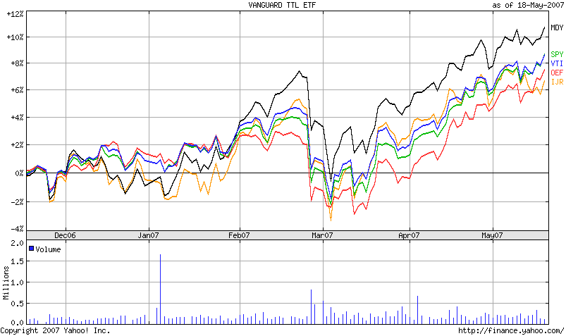 ETF Color Description --- ----- ----------------------------------------------------------- IJR Orange iShares S&P 600 Small-Cap stock Index, just smallcaps MDY Black MidCap SPDRs, S&P 400 Mid-Cap stocks VTI Blue Vanguard total US market index: ~5000 stocks (both small & large) SPY Green S&P500: top 500 large-cap US companies OEF Red S&P100: top 100 largest cap US companies (top subset of SPY)![]()