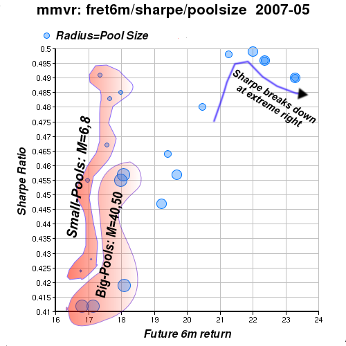 Since a picture is worth a 1000 words, let's take a look at 6-month future total-returns vs. Sharpe-ratios vs. pool-sizes for some random (ending May 2007) MMVR ranking sample. Each circle in the chart represents the return and Sharpe-ratio averages of a large number of different backtested portfolios. I annotated the chart for clarity: