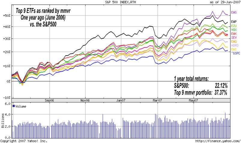 Using mmvr ranking method on 20070803 1 2.8472 EWY iShares MSCI South Korea Index 2 2.3886 TTH Telecom HOLDRs 3 2.3146 EWG iShares MSCI Germany Index 4 2.2428 VWO Vanguard Emerging Markets Stock VIPERs 5 2.0398 WMH Wireless HOLDRs 6 1.9702 PPA PowerShares Aerospace & Defense 7 1.9170 ITA iShares Dow Jones US Aerospace & Defense 8 1.8610 EWT iShares MSCI Taiwan Index 9 1.8239 VIS Vanguard Industrials VIPERs 10 1.8165 IAH Internet Architecture HOLDRs 11 1.7172 IXP iShares S&P Global Telecommunications 12 1.6907 EWC iShares MSCI Canada Index 13 1.6884 EWZ iShares MSCI Brazil Index 14 1.6556 EWP iShares MSCI Spain Index 15 1.5022 VOX Vanguard Telecom Services VIPERs 16 1.4494 DND WisdomTree Pacific ex-Japan Total Dividend 17 1.4314 PID PowerShares Intl Dividend Achievers 18 1.4156 XLI SPDR Industrial Select Sector 19 1.3945 PXJ PowerShares Dynamic Oil & Gas Services 20 1.3774 DLS WisdomTree Intl SmallCap Dividend 21 1.3559 EWN iShares MSCI Netherlands Index 22 1.3134 PHO PowerShares Water Resources 23 1.3106 SLX Market Vectors Steel 24 1.3053 EEM iShares MSCI Emerging Markets Index 25 1.2963 EWD iShares MSCI Sweden Index 26 1.2935 VAW Vanguard Materials VIPERs 27 1.2774 BHH B2B Internet HOLDRs 28 1.2661 FEZ streetTRACKS Dow Jones Euro STOXX 50 29 1.2511 PHW PowerShares Dynamic Hardware & Consumer Electronics 30 1.2204 ILF iShares S&P Latin America 40 Index 31 1.2153 PWJ PowerShares Dynamic Mid Cap Growth 32 1.2135 DNH WisdomTree Pacific ex-Japan Hi-Yld Eq 33 1.1859 PKB PowerShares Dynamic Building & Construction 34 1.1802 EZU iShares MSCI EMU Index 35 1.1722 EPP iShares MSCI Pacific ex-Japan 36 1.1601 FXI iShares FTSE/Xinhua China 25 Index 37 1.1491 IYJ iShares Dow Jones US Industrial 38 1.1486 EWS iShares MSCI Singapore Index 39 1.1316 MTK streetTRACKS Morgan Stanley Technology 40 1.1143 PTE PowerShares Dynamic Telecom & WirelessAssuming this is a temporary set-back, here's a good forward-looking very minimal portfolio (only 7 components) picked on 2007-08-03 by combining MMVR ranking with a "maximum alpha/beta_squared vs the SPY" optimization. The output includes a 24-week back-testing of the portfolio. Based on recent performance, including the recent correction (remember: past performance is no guarantee for future performance) this portfolio looks less risky than the SPY (smaller standard-deviation, 19% smaller worst week, 5% less beta, & only 0.64 mean internal correlation) and has a much higher weekly mean return, a 36% alpha, and better risk adjusted return characteristics.