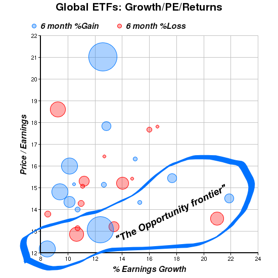 I'm now working with Tristan Yates and Juan Romero on a column which we hope will be published on Seeking Alpha. One of the thoughts we had, was to try and chart the best present opportunities internationally in light of the big drop.As a bonus, here's one of the charts I came up with. Look for strong candidates on the lower right frontier: good valuations coupled with good growth rates, which are now selling for much less than they were a month ago.
