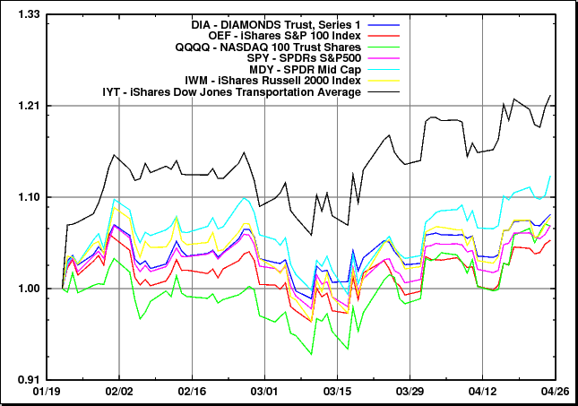- There's another pocket of great strength in the ETF IYT (Dow transportation sector) - a leading indicator of recovery. IYT closed well above the January bottom during the March bottom. This was a positive divergence that is now being confirmed broadly by the other major US indexes.
