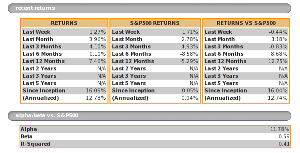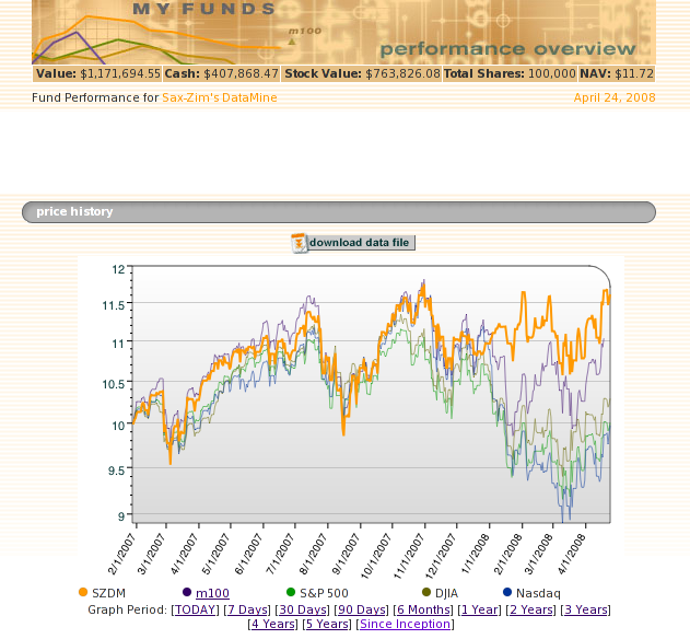 My Marketocracy SZDM portfolio is now almost at an all time high. I just got my first ever 3 green stars (1 year, 6 months, 3 months in the top 25%) thanks to the recent good calls on the imminent drop and what looked like a bottom in January (I was a bit early there). Moreover, the chart shows SZDM is now well above the m100 (best 100 portfolios on Marketocracy) average for the past year and since inception.