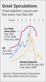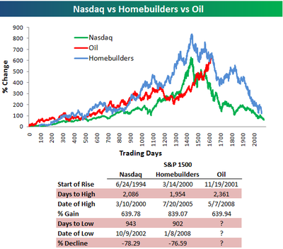 A recent Wall Street Journal article, looked at some recent bubbles in the markets: the tech boom in 1995-2000, the housing boom 2001-2006, and the recent Oil boom. The article makes the observation that bubbles take typically 5 years to develop till they peak, and that during these 5-years, the bubbly asset-classes typically go up about 6x - 8x in price.Here's the key image from the article: is Oil finally ready to pop? And a similar, easier to compare, chart by Bespoke, detailing the periods, the percentages of the increases and, for the NASDAQ and home builders, the drop to the bottom as well: