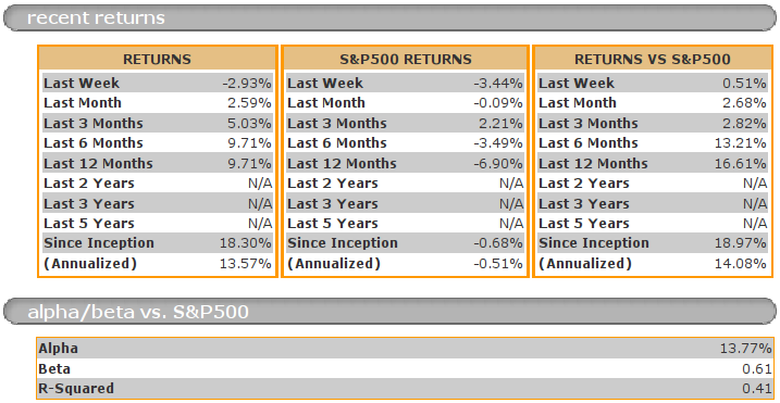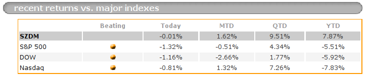 So the good news is that even with this drop, SZDM has been beating the major indexes pretty consistently. And it has done so, on all Marketocracy measured time frames: a week, a month, 3 months, 6-months and a year, all with lower volatility than the market.