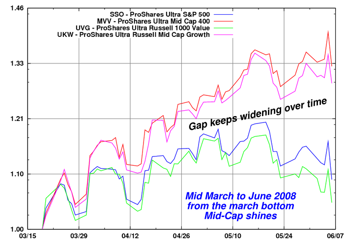 To set expectations straight, this trade will not work every day. In some days large cap value may lose less, or gain more than mid-cap. But as long as this pair is doing better than the market, on a roughly bi-weekly basis, it would be doing what I expect it to. If a full month passes and things don't work out as expected, I would reconsider the whole thesis.