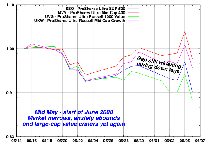For example, on Friday, June 6, a quintessental panic day, US mid-caps (MDY) fell sharply (-2.86%), but large-cap value stocks (IWD) fell even more (-3.18%). IOW: our trade would not only have avoided the huge 3% market drop, it would actually have gone up slightly, about 0.25%, last Friday thanks to the relative strength differential and the volatility leverage.