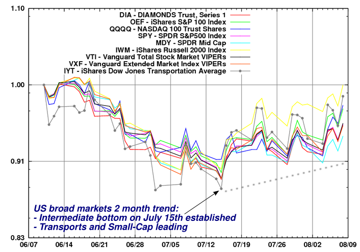 The broad U.S. markets have bottomed on July 15th, just two trading days after the model signalled a bottom, and have by now printed a series of higher lows, and higher highs (chart below).