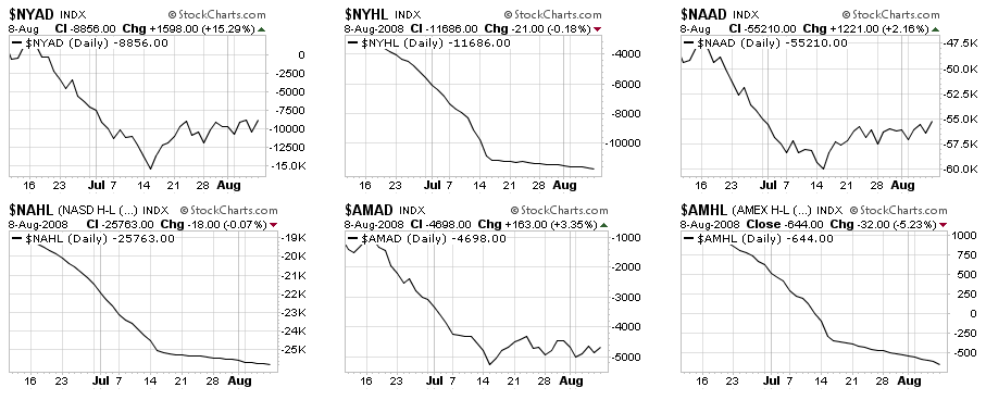Looking at the breadth picture, the advance decline lines are nicely up-trending, while the new high/low lines are still trending down (see chart below) but at a slower rate. This is due to the fact that the previous leaders (oil, materials, agribusiness) which were the ones making most of the new highs, are no longer making them while the rest of the stocks are so far away from 52-week highs that they are not likely to hit them anytime soon. This is ok, and actually healthy. I would focus on the Advance/Decline charts for now.