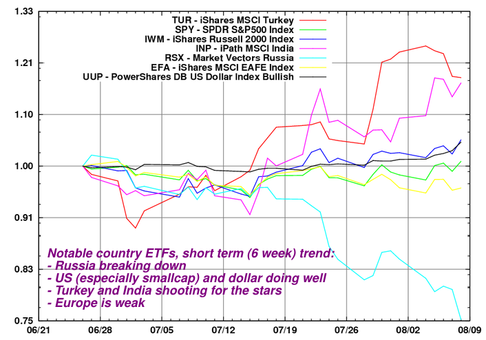 - The best country to be in right now is, surprise: the US. There are a few rockets like turkey (TUR) and India (INP) but they are so volatile and unpredictable that I would keep clear. India and Turkey are up 25-30% just a few weeks away from their recent bottom. As a rule: never chase parabolic movements except after a good pullback to the baseline.