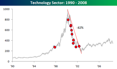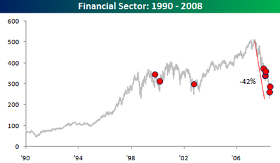 During the 2000-2002 bear market the tech sector crashed 82%. So far -- up to Jul 31 -- the financial sector was down about 42%. But we have to keep in mind, that the tech bubble was a bigger bubble at least as far as valuations are concerned, so how can we compare?