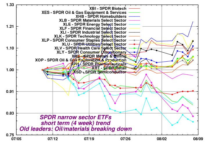 - Looking at narrow sectors, the new leaders are all the "dead-cat" bouncers (Financials, Home builders, Retail, Consumer Discretionary etc.) which I wouldn't be tempted to buy with the exception of a really short (2-3 week) trade, and only on pullbacks. In addition there's a potentially longer term hope in new leaders that do not belong to the "dead-cat" category, like biotechnology, and healthcare. (chart below, pardon the density).