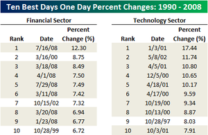 If we take the ten biggest up-days since 1990 in both the tech-sector and the financial sector, we'd see that almost all of them occur during their respective bear periods. Images courtesy of Bespoke Investment Group: