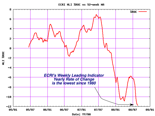 - ECRI (The Economic Cycle Research Institute) Weekly Leading Indicator (WLI) annual rate of change (ROC) has just hit a fresh 28 years low at -11.8 (See chart below).