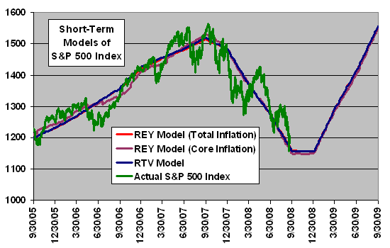 Then, there's help from unexpected places. I try to do a lot of legwork trying to find the best data-driven bloggers; those with the good actual records, so you don't have to. I recently discovered an excellent site: Steve LeCompte's CXO Advisory This is a rare treasure combining data-driven analysis, modelling, and great skepticism. Every hypothesis is checked and either verified or refuted statistically. Most importantly, Steve have developed three models predicting the S&500 for a year ahead, based on corporate earnings, inflation, and fixed-income yields. A combo of the 3 models now projects the S&500 to about 1550 by September 2009. (chart below). Given the accuracy of these models in the past, and Steve's excellent other work, I'll be reading Steve LeCompte on a regular basis.