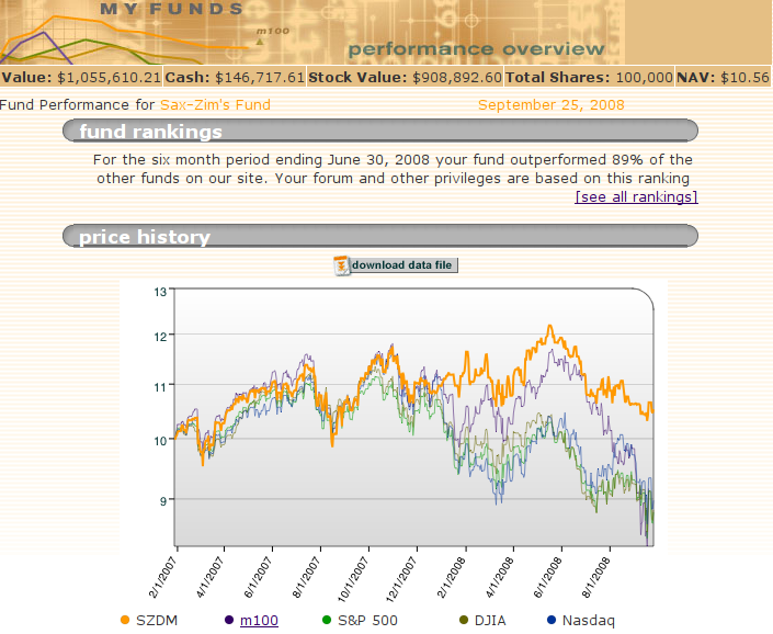 Unfortunately, Marketocracy forces players to be mostly invested at all times. "As a money manager, you're not being paid to sit on cash" is their strange justification for this rule. This makes managing a Marketocracy portfolio successfully, even more challenging than managing one's own real-life portfolio. Right now, SZDM is 86.1% invested, expecting the bailout-plan rebound and the calm over the future of Goldman Sachs and many strong financials to lift the markets. It is also prepared to partially lighten-up positions on any out-of-the-norm spike and conversely, to load-up on any extreme short term dip.