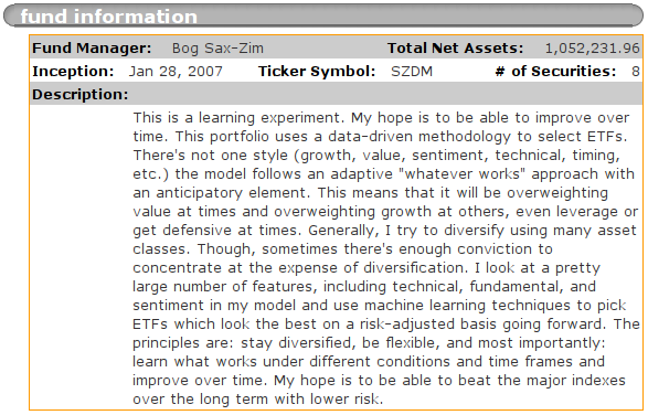 It was only during the bear period that SZDM was able to beat, not only the 3 major indexes, but also the average of "the m100," (the 100 best investors on the site) as represented by the dark-purple line on the above chart. One should note that the m100 is not a fixed group, so survivorship bias applies. The next year m100, should be different than the last year m100. Obviously, some of any out-performance is a matter of sheer luck. This explains how come last year's m100 has performed so badly lately. Those who were riding the commodities/energy bubble have faltered and their record has deteriorated. This is also why Marketocracy keeps emphasizing to its members that they should seek a long-term and stable record as opposed to lucky strikes.