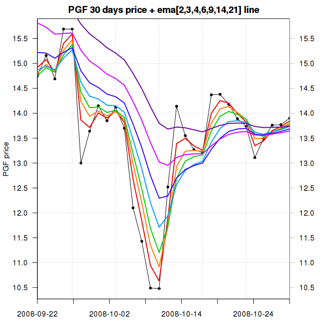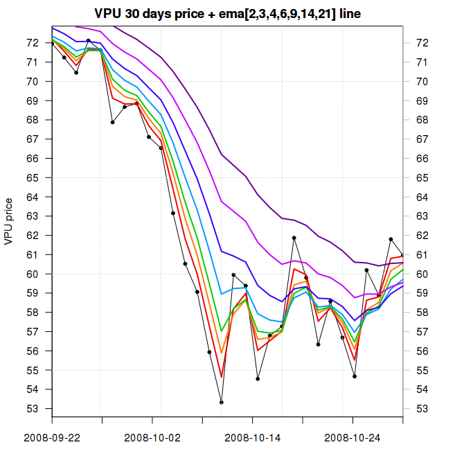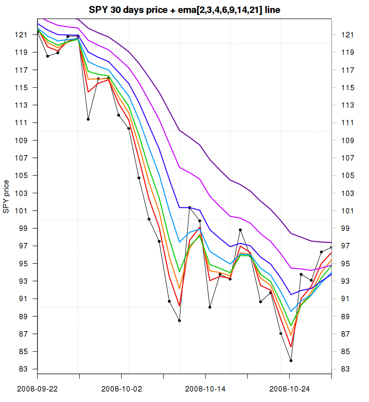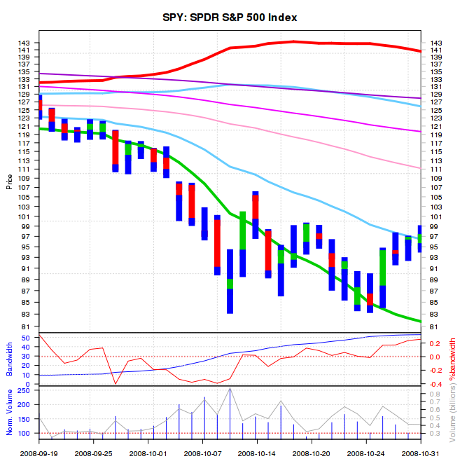 I recently wrote some R functions that let me zoom in in large detail on ETF charts. Let the charts do most of the talking.The 1st is the SPY chart. Last 30 days of trading (6 weeks). The light pink line is the 50-day simple moving average with one and two standard deviations above and below it marked in red and green respectively. The light turquoise line is the 1-standard deviation Bollinger Band of the 50-day moving average. The colored segments represent open, close, high, & low prices. Lines with a open to close range colored red are down days from open to close, and those whose middle is green have closed higher than the open. The two down-slopping purple and violet lines are the 100-day and 200-day moving averages respectively. They tell us that the major (long term) trend is still a clear bear. In the short term, on the other hand, we see clear consolidation and stabilization after the October big crash.