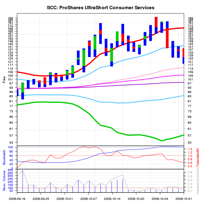 Next: SCC, the Proshares Ultrashort Consumer Services ETF. One of the "safest" double short ETFs in times like these. SCC more than doubled in the past month. It is now in the middle of a sharp crash demonstrating how risky it can be to try and chase short term extreme momentum.