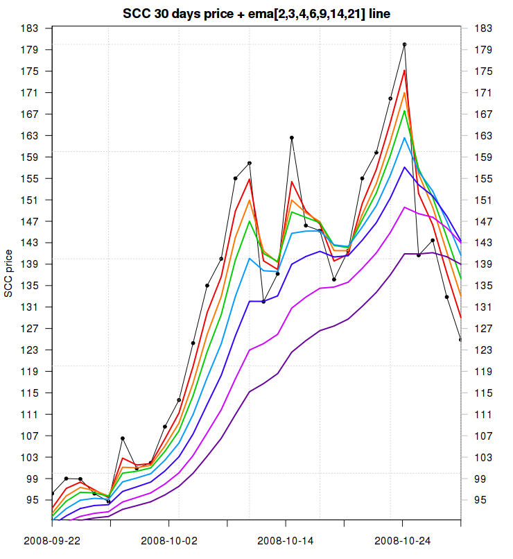 In the SCC case, the short-term EMAs are inverted in the opposite direction. What's the next stop for SCC? 113 on the 50-day SMA? 105 at the 100 day SMA? Perhaps 98 or so at the 200 day SMA and the prior support? Be very careful trying to get into shorts too early when they are in a free fall.