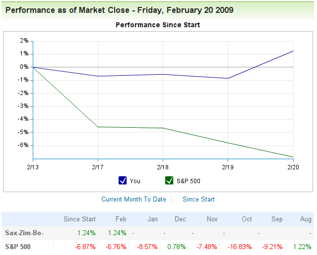 Another week has passed, and our system have been further tested.As I explained and wrote before, I had to switch from Marketocracy.com to another 3rd party auditing system to track my performance in a more realistic way. I looked at a few and chose UpDown.com. The UpDown.com site is much more responsive, easier to place trades on, allows shorting, has an up-to-date ETF database, among other advantages.