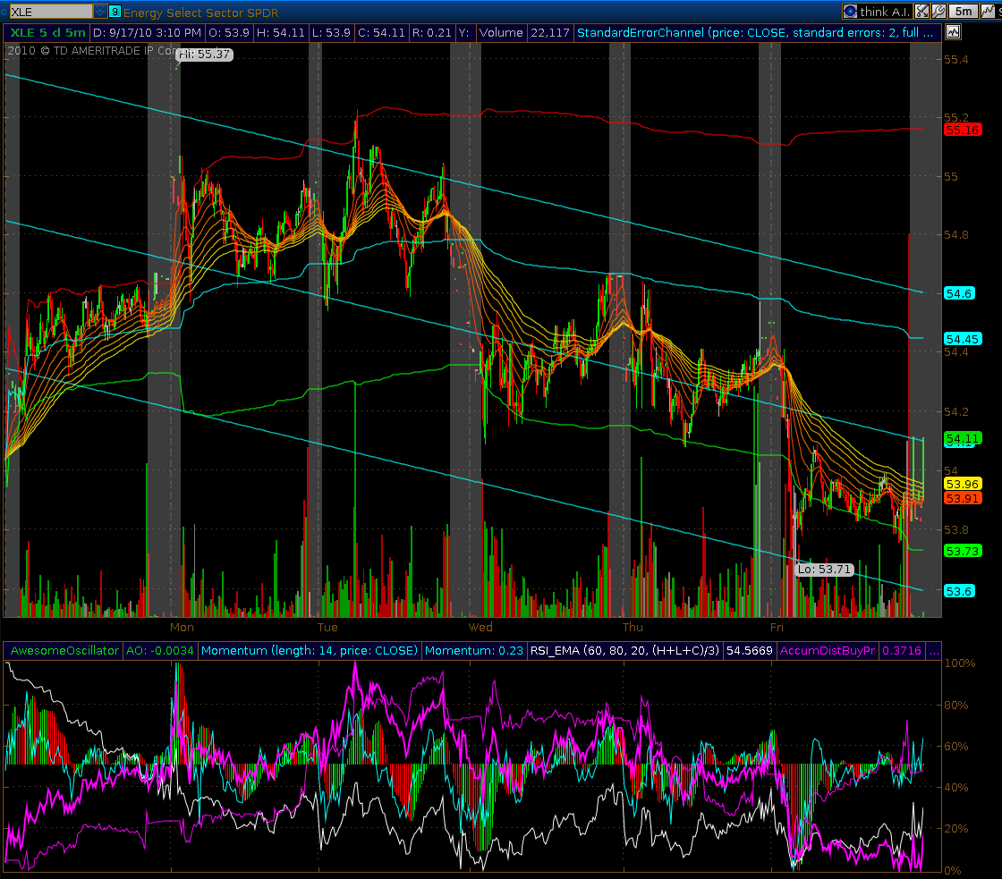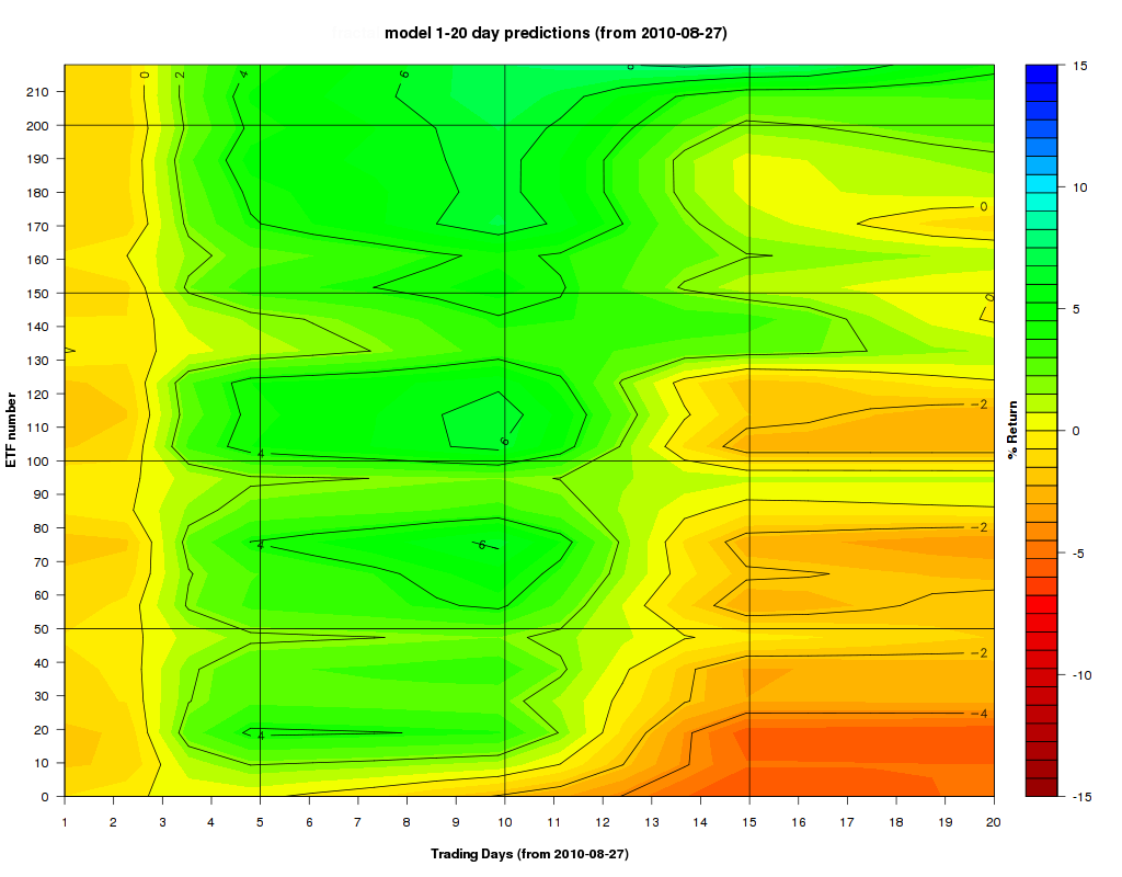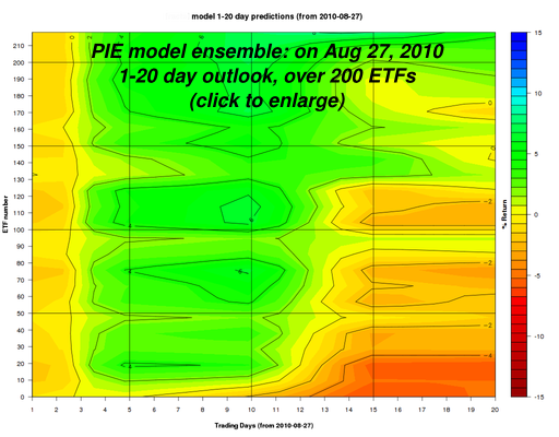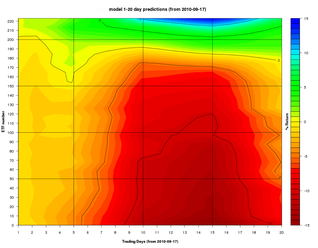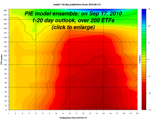 First, is what my ensemble of multiple independent models, looking at over 200 ETFs (excluding short and leveraged ETFs) looks like at the end of trading on Friday, Sept 17, 2010.Think of it as a synoptic weather-map, with yellow being neutral (0% change), orange/red meaning "down" from here, and green/blue meaning "up" from here. The left edge of the chart represents a one day prediction from last Friday's close, and the right edge represents the 4-week (20 trading days) outlook with all the future 1-20 days in between.