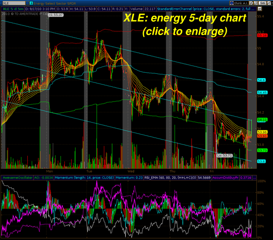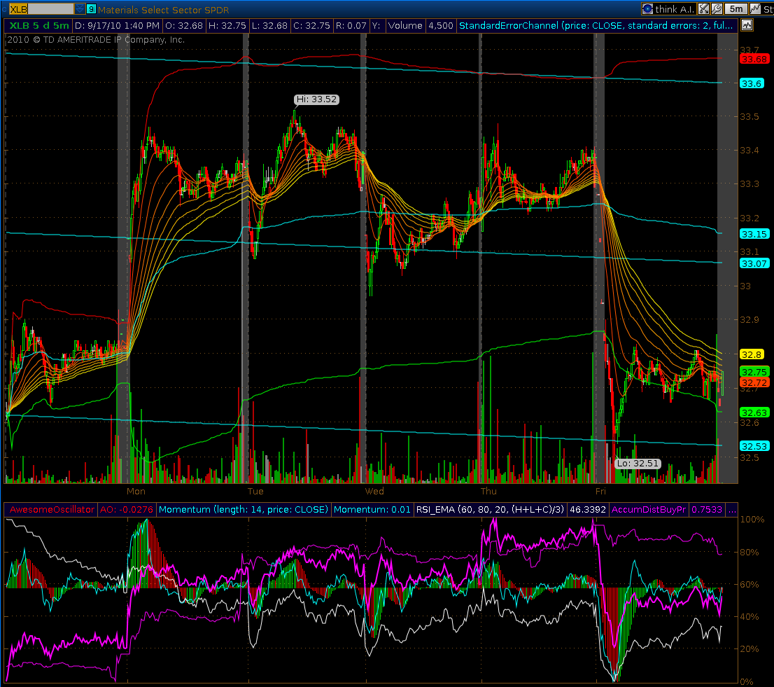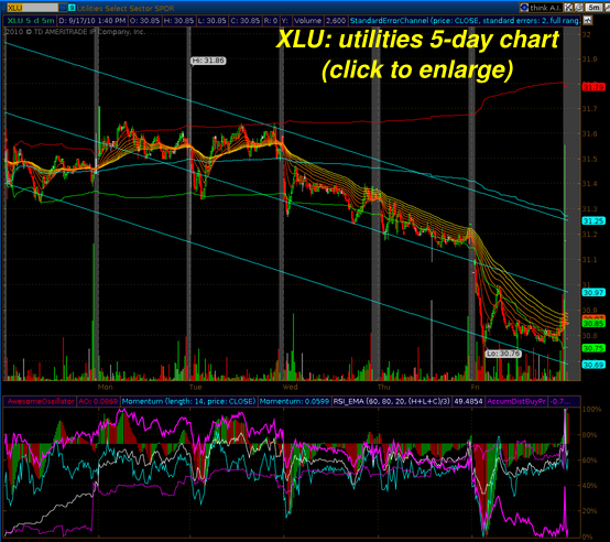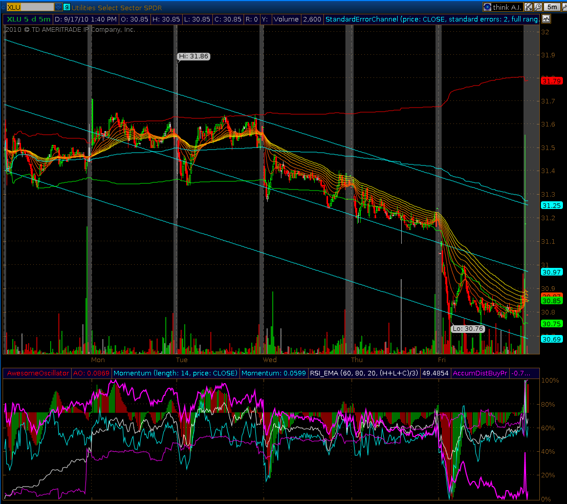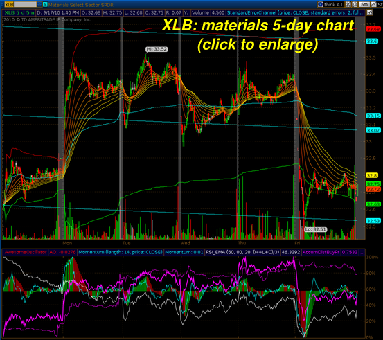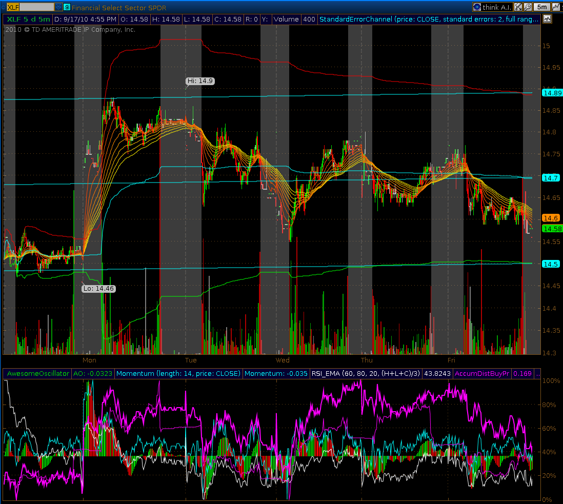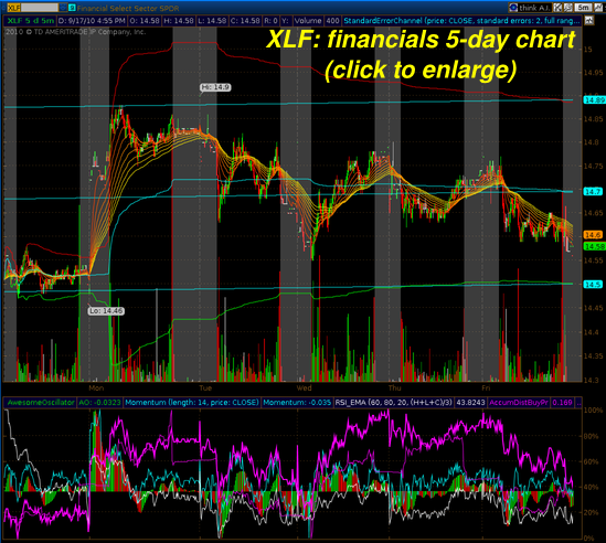 A 4th sector: financials (XLF) has been making lower highs for 3 days, its 5-day VWAP has been declining for 3 days, and its 5-day average trend (straight blue regression lines) is now very close to a tipping point.