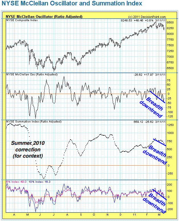 Last, but not least, here's a look at market breadth via the NYSE McClellan oscillator (NYMO). Note that this is a 1-year chart in which we can see the last meaningful (> 5%) bull market correction (April to August 2010) in the context of the current one. Not only we are nowhere near the magnitude of the 2010 correction, we are clearly in a downtrend in terms of market breadth telling me that chances are we haven't seen the bottom yet.