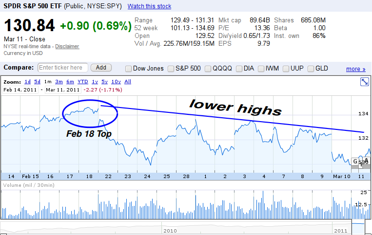 To anyone who has missed the intermediate-term top on almost 3 weeks ago, here's the 1-month SPY chart showing the mid-day top @ 134.69 on February 18. The chart is showing a series of lower highs since Feb 18, 14 trading days ago.