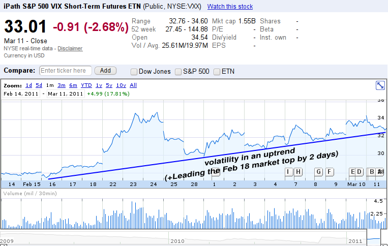 VXX is an ETN (Exchange Traded Note) which is a proxy of short term volatility (as represented by ~1 month forward VIX future contracts). Notwithstanding this Friday's -2.68% drop, VXX has been in a clear (and rather unusual) uptrend since February 16 (16 trading days ago):