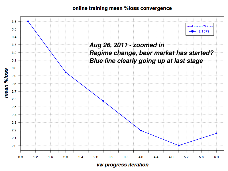 What about today? Fast forward to October 19, 2011. The divergence is alive and well. The error rate is now about 20% above its trough. Obviously the model is yet to fully unlearn what it has learned during the bull market.What should we expect in the future? Here's my guess based on my data: at a certain point, once we have enough history of typical bear-market conditions, the error rate should level-off and approach the bear market inherent ambient error level asymptotically. At that point, since we'd have a consistent (all bear) training set, I expect the chart to go monotonically down again but stop descending at a much higher level that it did during the bull. Looking back, the "ambient error" was about 3.37% for the average month-ahead prediction, at the beginning of March 2009 (just before the end of the prior bear). Interestingly, at that point in time it has already been slightly declining as the volatility of Jan-Mar 2009 was lower than the post Lehman bankruptcy rout (Sept-Oct 2008).