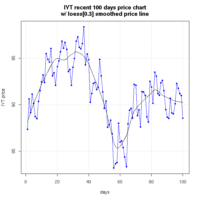 For comparison, I did a similar exercise 4 days later with a more volatile ETF: IYT, the Dow Transportation ETF. Here's IYT's 100-day chart: