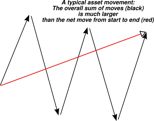 While looking at thousands of charts over time, I was struck many times by the remarkable fact that the overall distance traveled by these charts is so much bigger than the net-distance from start to finish. Just as a river meanders trough rough terrain going through countless wiggles, so do stock charts zig zag seemingly randomly between almost any two points. There's a fractal-like nature to these charts: if one looks at monthly, or weekly, or daily charts there's some surprising similarity between the short term and the long term charts. Wiggles exist in every time frame and the ratio between the overall distance and the net distance seems strikingly similar.