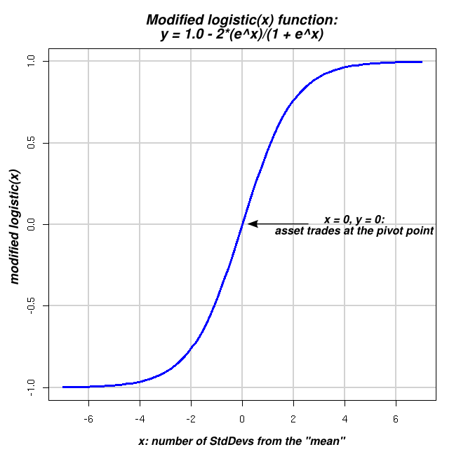 http://en.wikipedia.org/wiki/Logistic_functionAnd where P0 (position zero) is our position at the pivot. P0 is 1.0 for fully invested, 0.5 being half in cash, etc. L is our leverage, or the strength of our contrarian conviction. The greater L is, the bigger the position we feel comfortable taking against the short-term moves. Finally: S is the number of standard-deviations in which the asset trades above/below the pivot. S is determined using a sample of prices in some sliding window of time, typically one year (252 trading days).