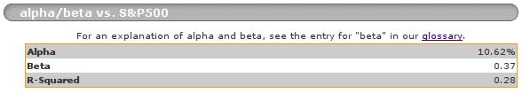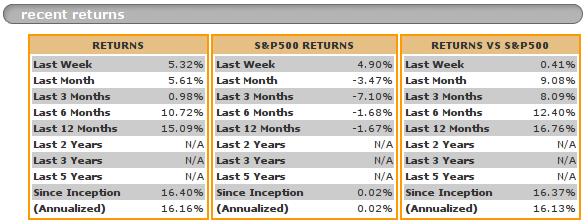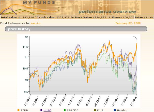 The bottom line is that as of February 2nd, 2008, a year + a few days since its inception, SZDM had a 16.37% total return advantage vs. the S&P500. In addition, it has a much lower volatility: a beta of 0.37, vs. the S&P500.
