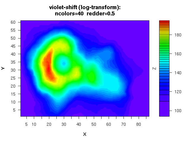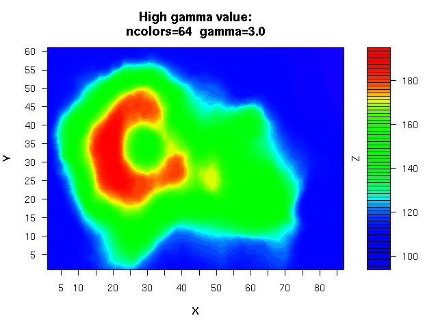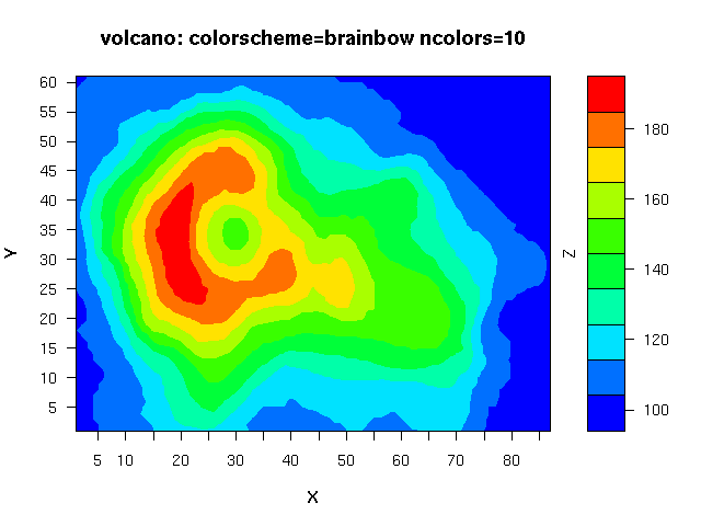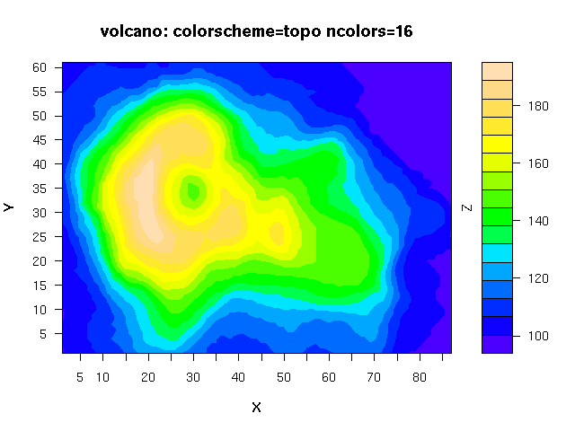 - several color-schemes for the Z dimension at the time of this writing the supported schemes are: 'rainbow', 'brainbow', 'danger', 'topo', 'terrain', 'gray', 'cm'. The default is my personal favorite: rainbow.